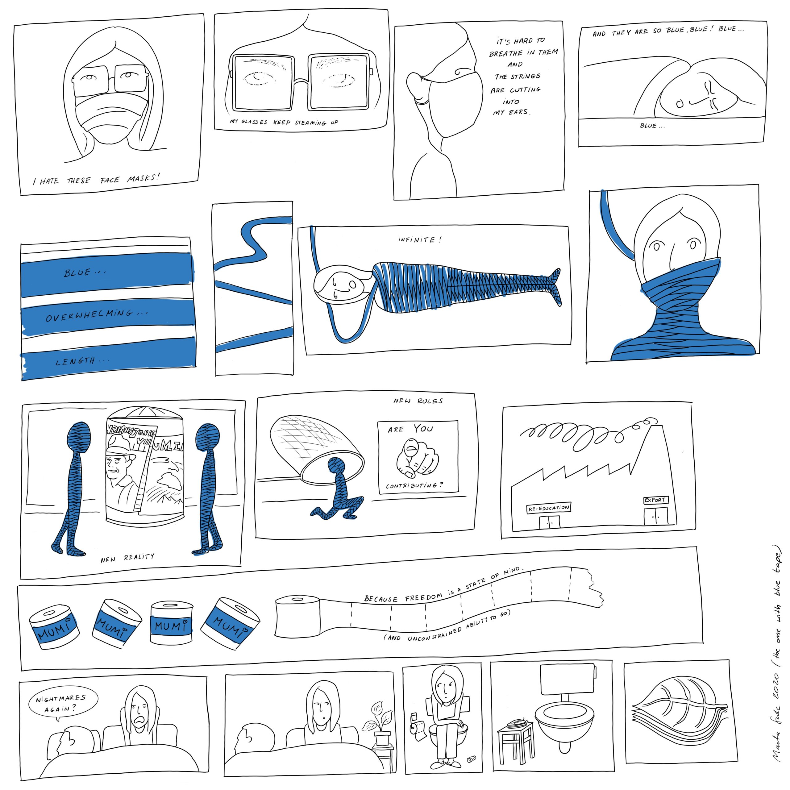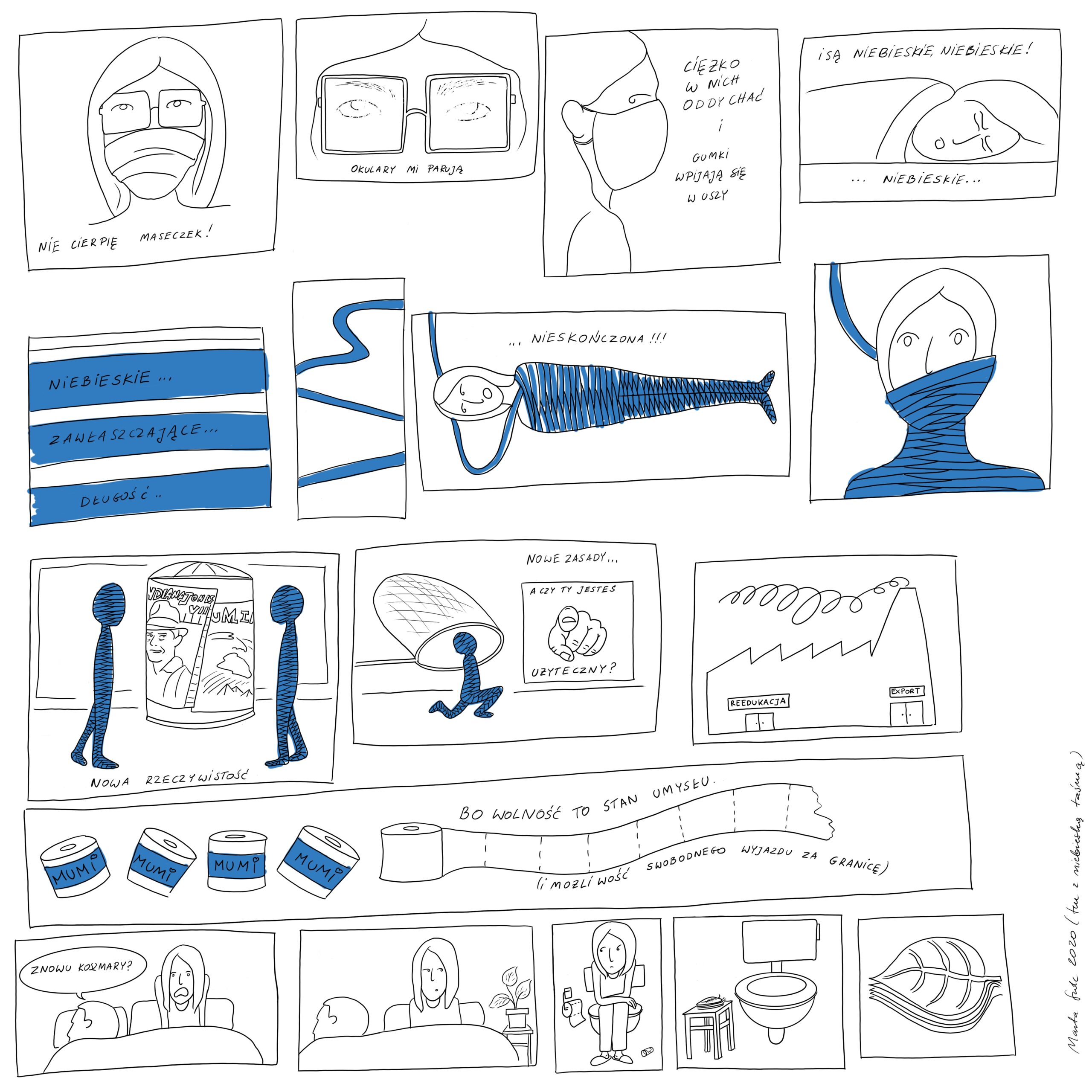 #40 is a set of short, surreal stories, in which the influence of quarantine restrictions is mixed with art. They served as a safety valve for the author as she drew them fast and negligently, which resulted in the casual form of a comic book. The work contains references to Teresa Murak, Edward Krasiński, SAM Rozkwit group as well as Louise Bourgeois, Stranger things, The Black Square and Dune.