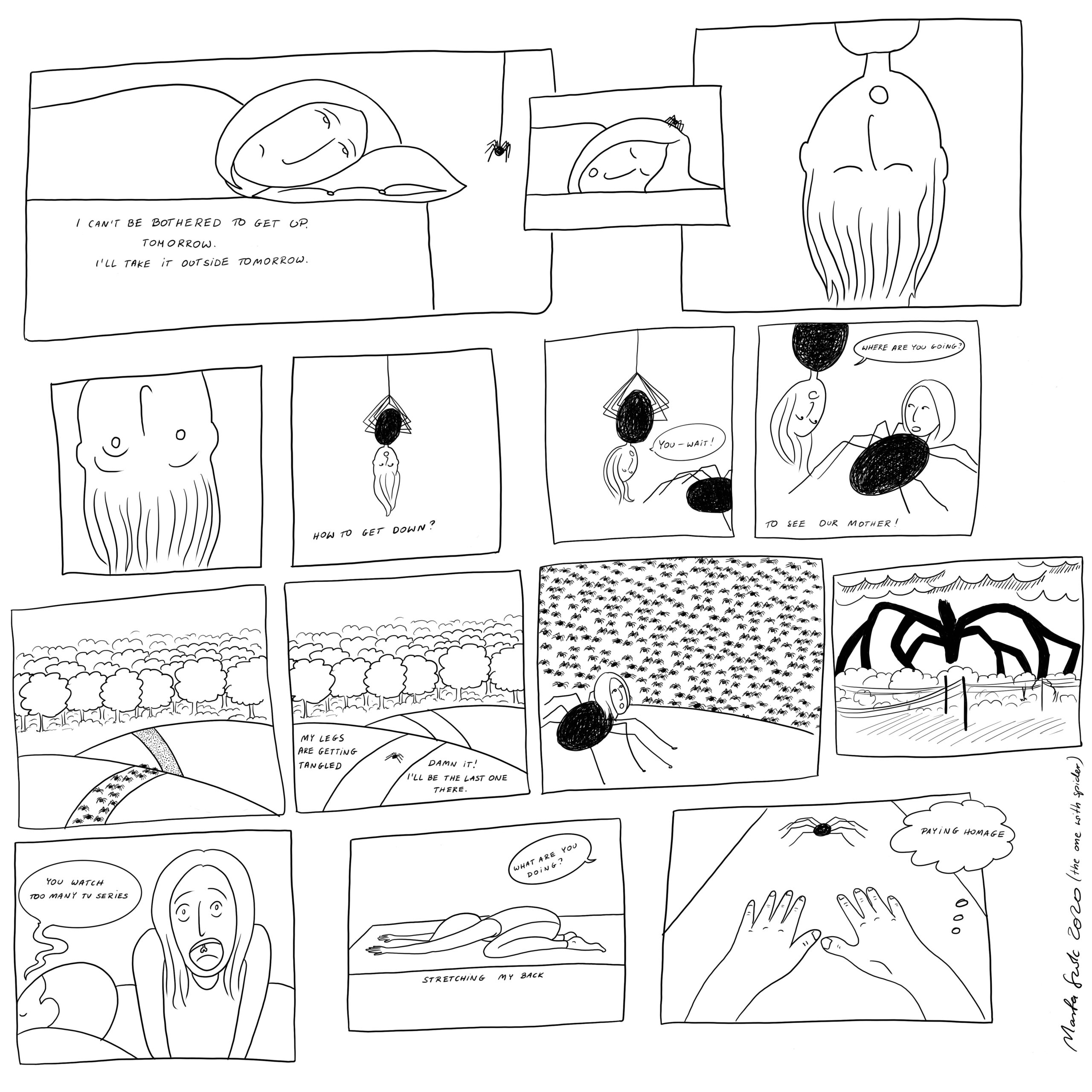#40 is a set of short, surreal stories, in which the influence of quarantine restrictions is mixed with art. They served as a safety valve for the author as she drew them fast and negligently, which resulted in the casual form of a comic book. The work contains references to Teresa Murak, Edward Krasiński, SAM Rozkwit group as well as Louise Bourgeois, Stranger things, The Black Square and Dune.
