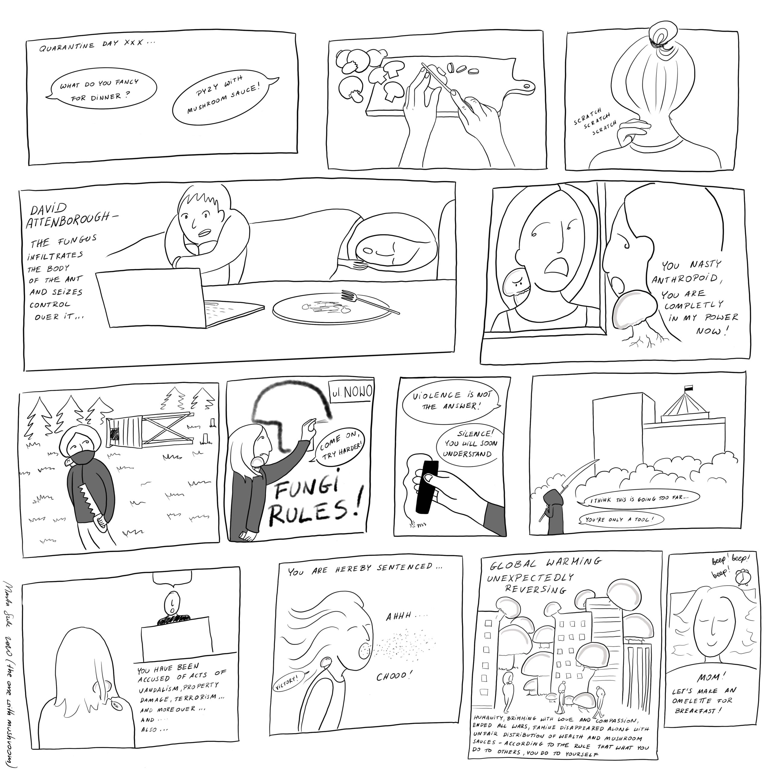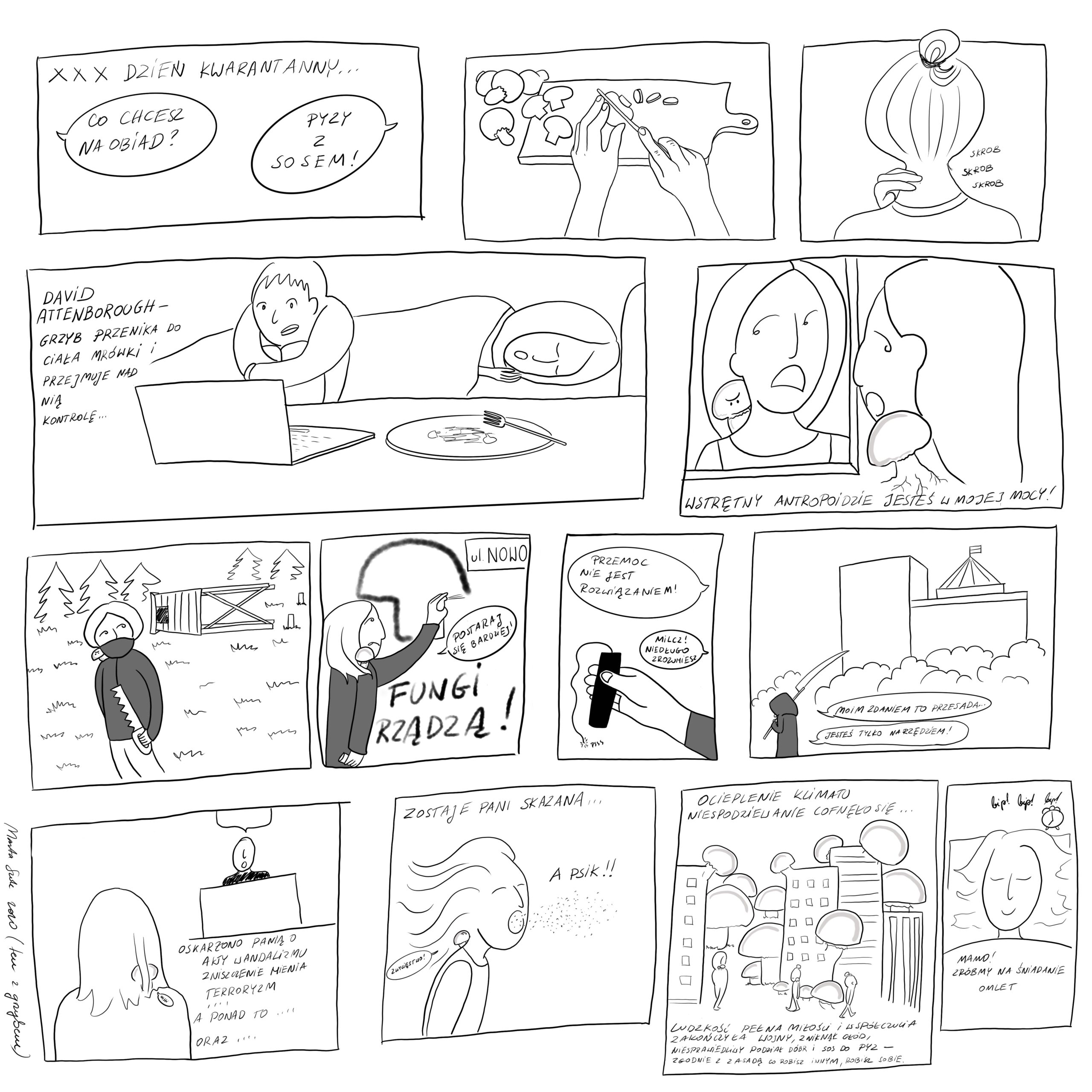 #40 is a set of short, surreal stories, in which the influence of quarantine restrictions is mixed with art. They served as a safety valve for the author as she drew them fast and negligently, which resulted in the casual form of a comic book. The work contains references to Teresa Murak, Edward Krasiński, SAM Rozkwit group as well as Louise Bourgeois, Stranger things, The Black Square and Dune.