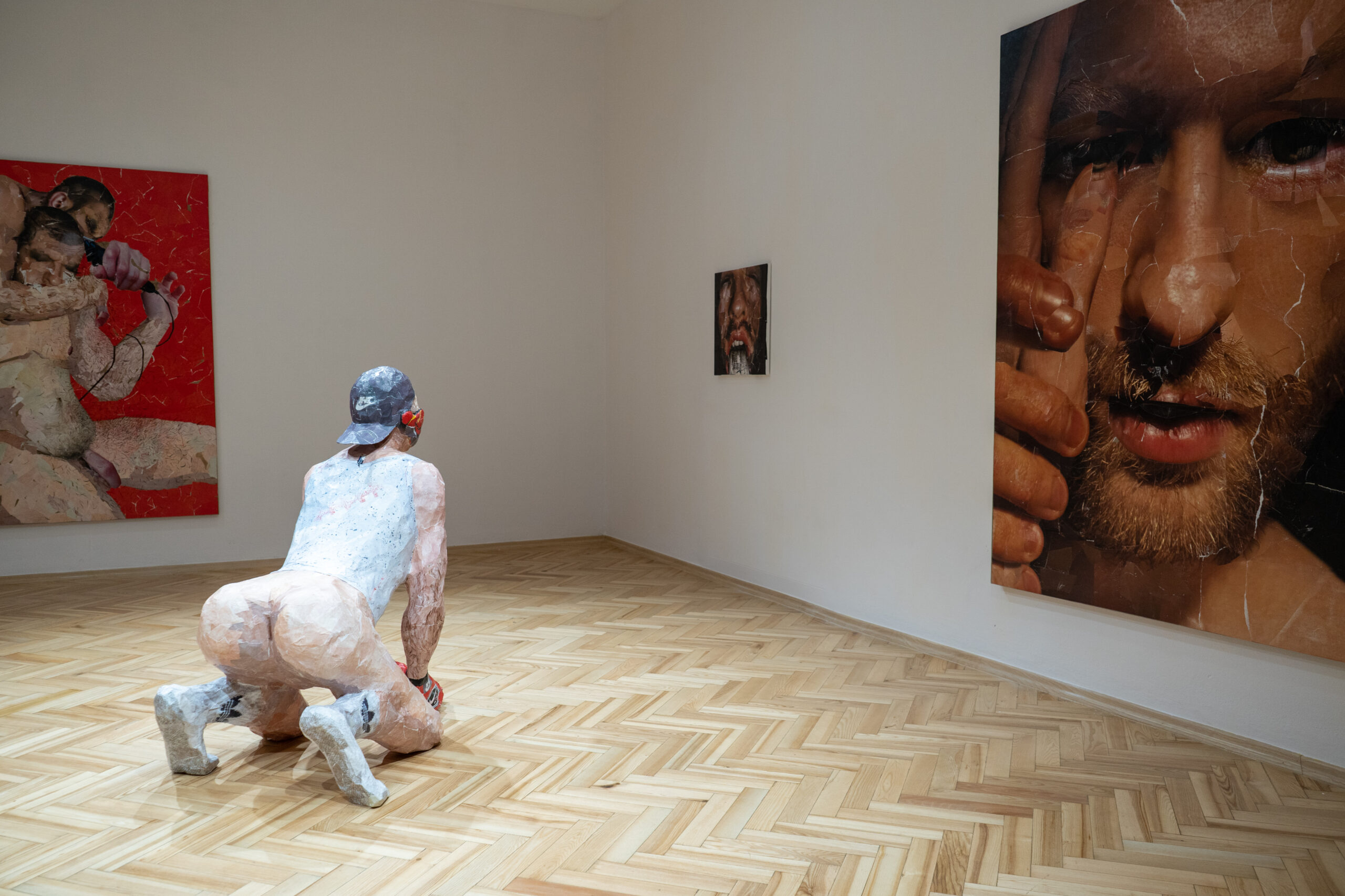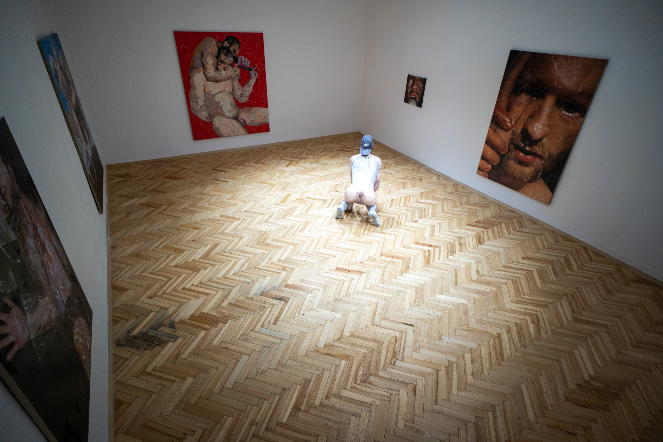 Most of the objects refer to the issue of work and reflect upon the problem of alienation, which results from it. There are motifs of physical, emotional and sexual labor, of labor as a life mission and as atonement. The only sculpture, which looks as if extracted from gay porn, is titled ‘The Floor Scraper’. It depicts something between a sex worker and a manual worker renovating a wooden floor – definitely a person totally unprepared to perform the assigned task, equipped with gay fetish accessories instead of professional construction tools.